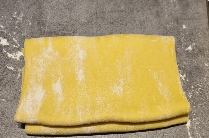 Faites de nouveau un quart de tour et étalez votre pâte dans la longueur, puis coupez la en 2 dans la longueur.