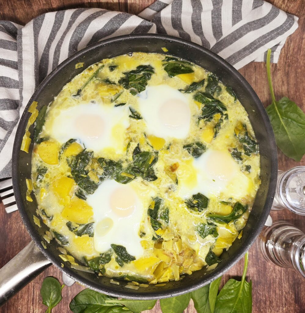 La chakchouka aux pommes de terre et épinards est une recette d’inspiration méditerranéenne composée d’une base de légumes mijotés, relevée d’épices comme le paprika ou le cumin. Les pommes de terre apportent consistance et douceur, tandis que les épinards ajoutent fraîcheur et couleur.