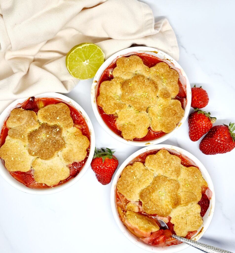 Impossible de résister à ce cobbler fraises rhubarbe coco et citron vert ! Entre les fruits fondants, la douceur de la noix de coco et la fraîcheur du citron vert, ce dessert est un concentré de gourmandise et de soleil. Parfait pour profiter pleinement des fruits du printemps.