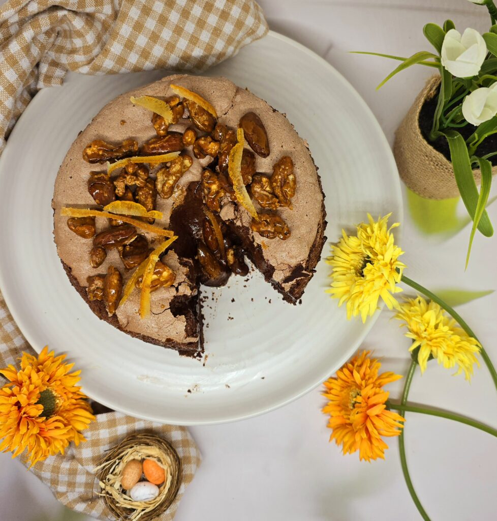 Envie d’un dessert spectaculaire pour célébrer Pâques ? Le gâteau au chocolat meringué combine l’intensité d’un fondant au chocolat avec une fine couche de meringue croustillante. Gourmand, élégant et légèrement craquant sur le dessus, il est idéal pour clôturer un repas pascal en beauté.