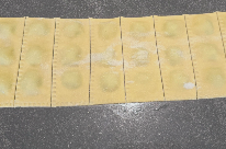 Mouillez légèrement au pinceau les contours de tous vos petits tas de farce et posez la seconde bande de pâte par dessus en veillant à bien chasser l'air. Soudez bien les ravioles (soudez vraiment bien, sinon ils s'ouvrent à la cuisson !) et découpez les à l'aide d'une roulette.