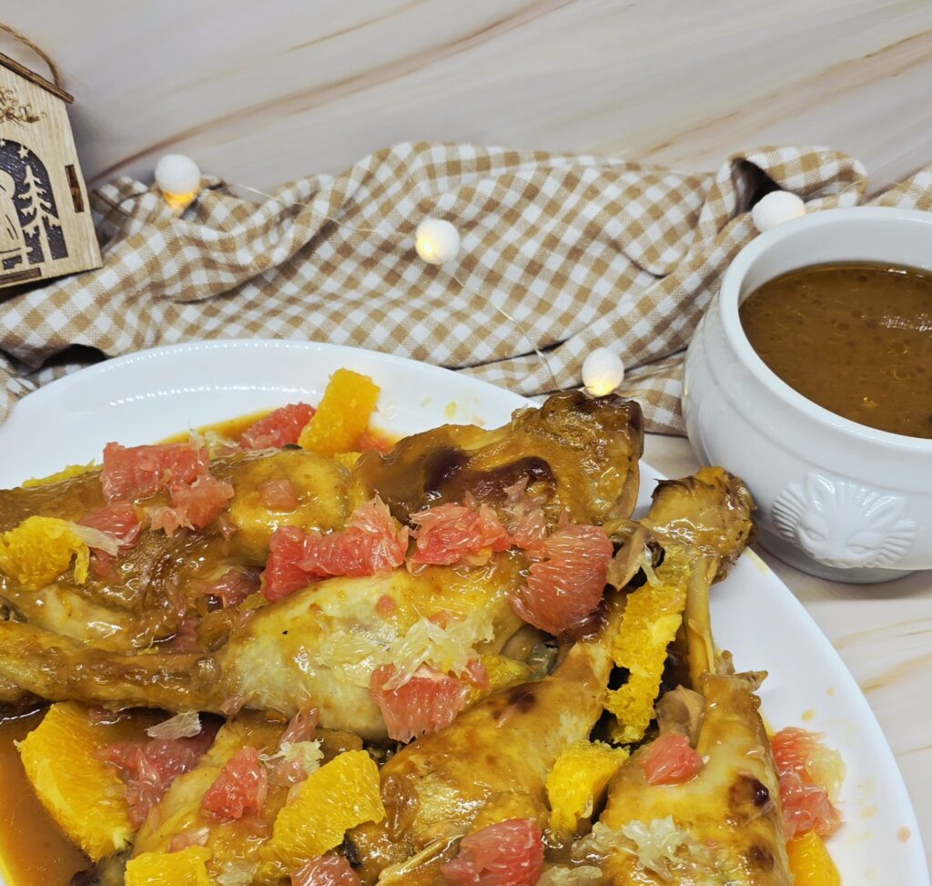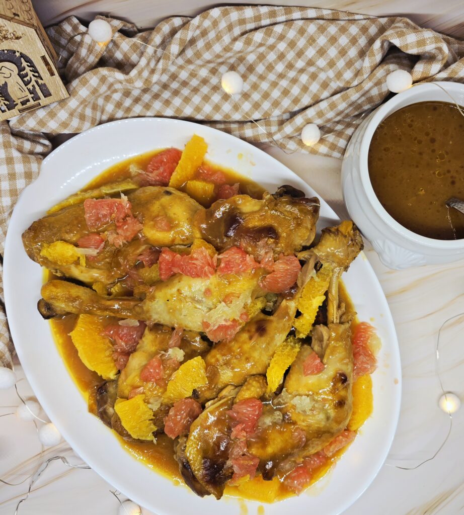 La volaille aux agrumes et épices de Noël est un plat raffiné qui marie tradition et exotisme. La viande, rôtie lentement au four, reste tendre et juteuse tout en s’imprégnant des arômes d’orange, de clémentine ou de citron.
